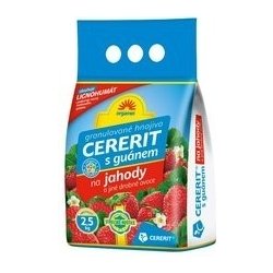 CERERIT S GUÁNEM na jahody a jiné drobné ovoce je organominerální granulované hnojivo se stopovými prvky, určené pro jahody a jiné drobné ovoce. Výrobek obsahuje minimálně 60% originálního hnojiva CERERIT GSH NPK 8-13-11.