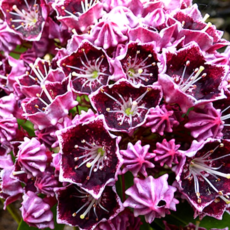 KALMIE ´LATCHMIN´KALMIE ´LATCHMIN´ - (Kalmia latifolia ´Kardinal´) je stálezelený nízký keř, který je kříženec kalmií Mitternachtt a Kaleidoscope. Je též nazýván jako horský vavřín. Původem je z USA. Roste pomalu a po 10ti letech má kultivar výšku 100 cm a šířku 80 cm. Vytváří široký, kompaktní keř. Listy jsou široké, eliptické, tmavě zelené. Květy miskovitého tvaru jsou červeno bordové s výrazně bílými tyčinkami a jemným bílým lemováním. Mají v v průměru 2,5 cm. Květy, které se objevují ve druhé polovině května, jsou nádherné a to jak zavinuté tak i v plném květu! V květenství je velké množství květů v jednom trsu. Květy neúnavně kvetou téměř celý měsíc. Pěstujeme obdobně jako rhododendrony v kyselé půdě. Pozor na přímé slunce, listy se mohou popálit. Vysazujeme na polostinná stanoviště. Ke kořenům mladých rostlin přihrnujeme na zimu půdu nebo zakryjeme mulčem. Můžeme přihnojovat hnojivem na rhododendrony. Vysazujeme v kombinaci s dalšími vřesovištními dřevinami. Rostlina je jedovatá. Plně mrazuvzdorná. Dodáváme v kontejneru P9.
