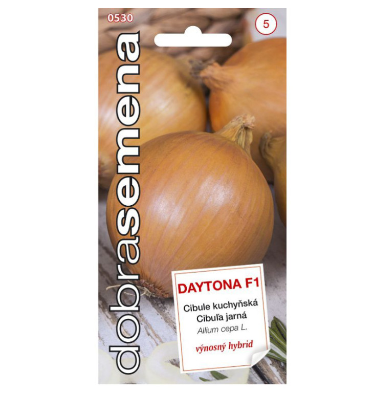 DAYTONA F1 - velmi výnosný a spolehlivý hybrid Španělského typu cibule odolný fusarióze a "růžovění kořenů". Vytváří veliké cibule s pevnou žlutohnědou slupkou a s vynikající skladovatelností. Silný kořenový systém zajišťuje vysoké výnosy i v suchých oblastech.